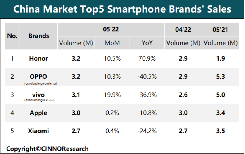 从5月排名来看,荣耀和OPPO排列1、2名,环比别离增加10.5%和10.3%,荣耀同比增加70.9%,OPPO则同比下降40.5%。