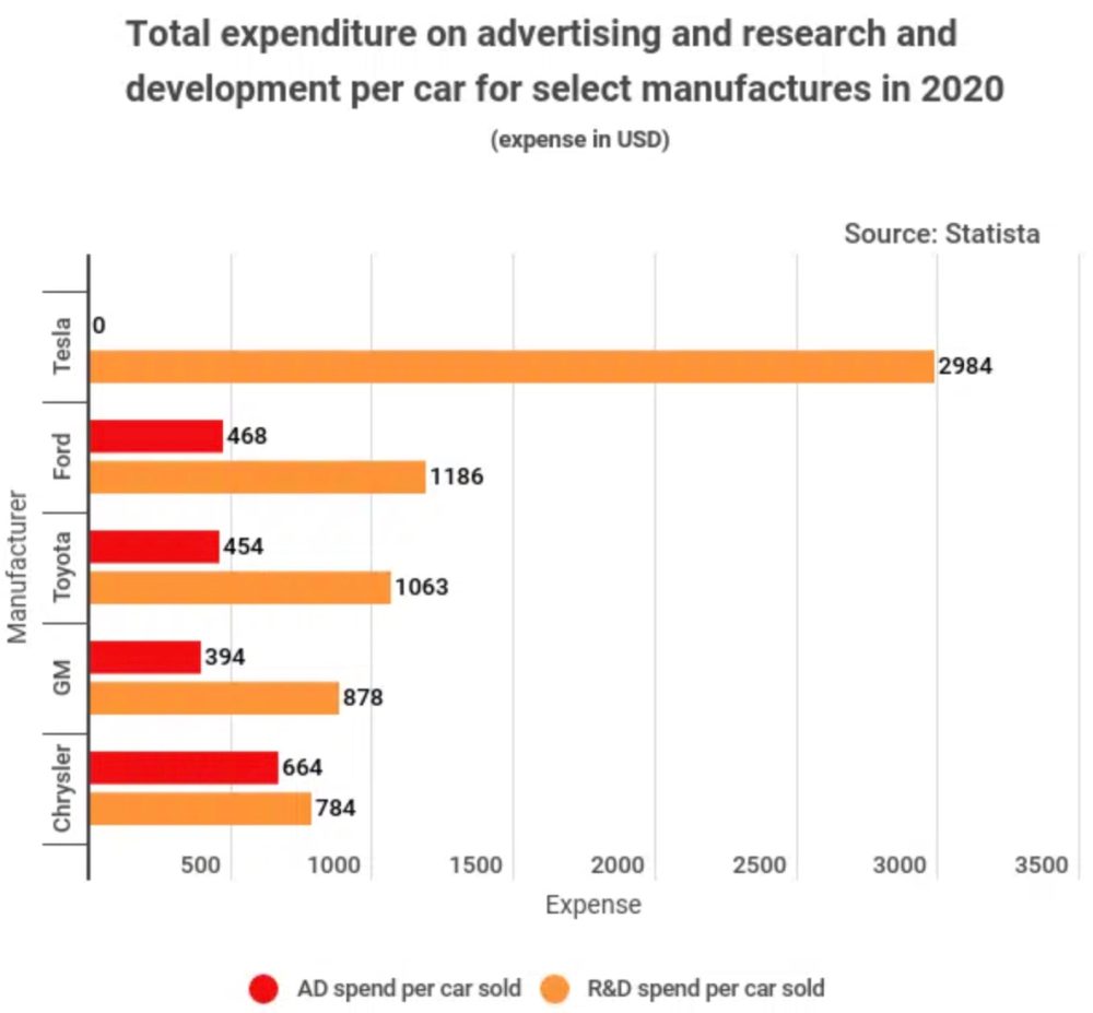 一份新陈述显现,特斯拉在每辆轿车的研制 (R&D) 上的开销远远超越任何其他轿车制造商,并且在每辆售出的轿车上的广告开销最少。