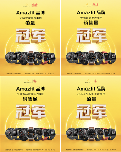华米科技旗下 Amazfit 品牌一举斩获天猫智能手表类目销量冠军、天猫智能手表类目预售量冠军、小米有品智能手表品类销量冠军、小米有品智能手表品类出售额冠军。