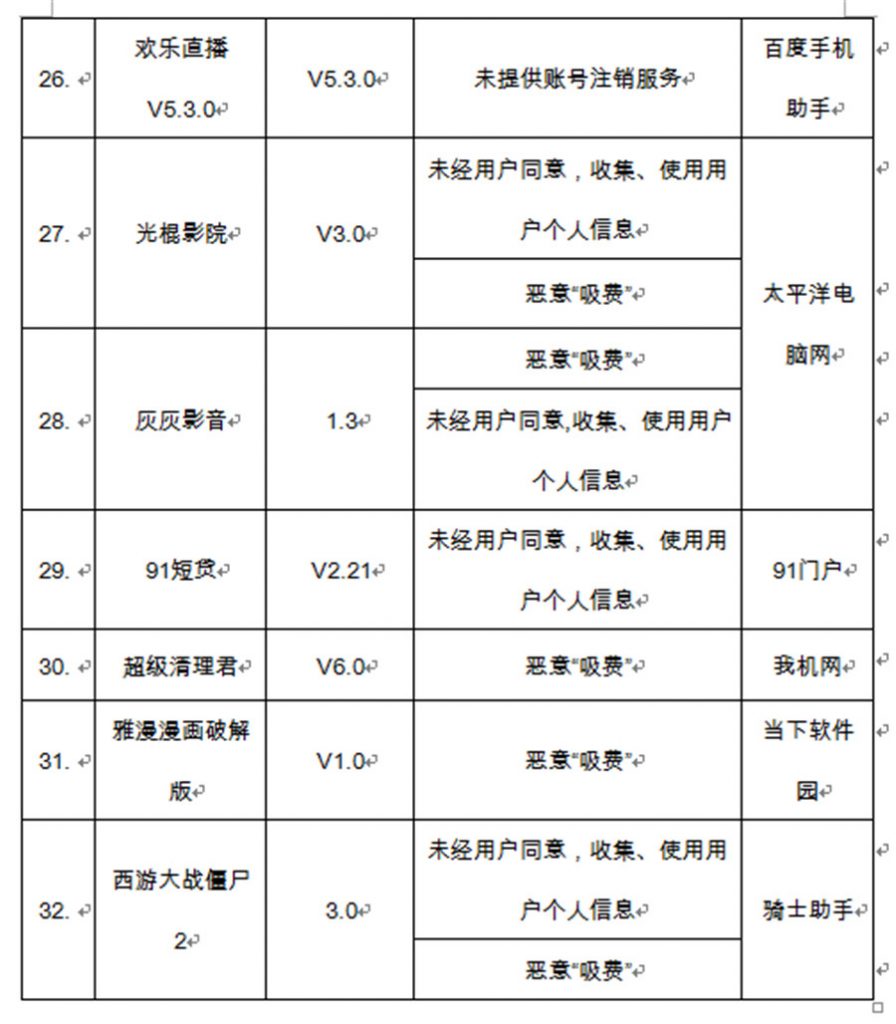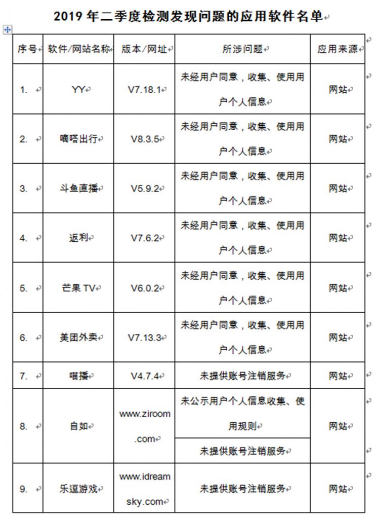 报导,近来,工信部发布的电信服务质量的布告显现,2019年二季度检测发现问题的应用软件有YY、嘀嗒出行等32款软件,所触及的问题包含未经用户赞同,搜集、运用用户个人信息;未供给账号刊出服务;强行绑缚推行其它应用软件和歹意吸费等。