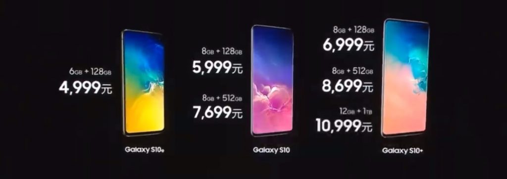 Galaxy S10e 供给 6GB RAM + 128GB ROM 版,价格 4999 元;Galaxy S10 供给 8GB RAM + 128GB ROM 版,价格 5999 元,以及 8GB RAM + 512GB ROM 版,价格 7699 元;Galaxy S10+ 供给 8GB RAM + 128GB ROM 版,价格 6999 元,8GB RAM + 512GB ROM 版价格 8699 元,12GB RAM + 1TB ROM 版价格 10999 元。Galaxy S10 系列的我国版也将在 3 月 8 日上市。