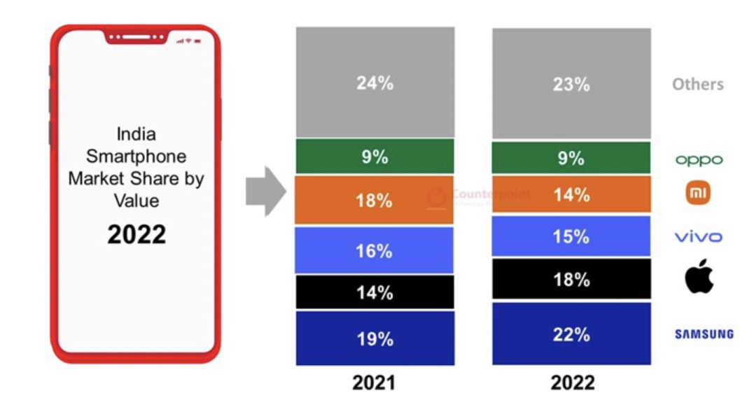 - 到 2022 年,印度智能手机高端商场(>30,000 印度卢比或约 365 美元)对该商场的出货奉献为 11%,对收入的奉献为 35%,均创前史新高;